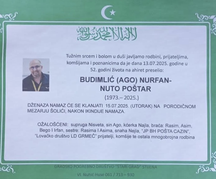 Dženaza namaz će se klanjati u utorak 15.07.2025. na mezarju porodičnom mezarju ŠOLIĆI nakon ikindije namaza.
