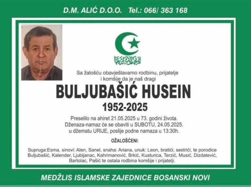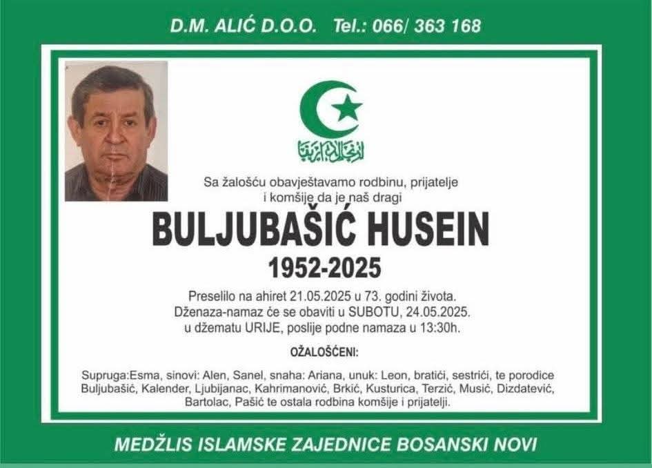 Dženaza-namaz će se obaviti u SUBOTU, 24.05.2025. u džematu URIJE, poslije podne namaza u 13:30h.