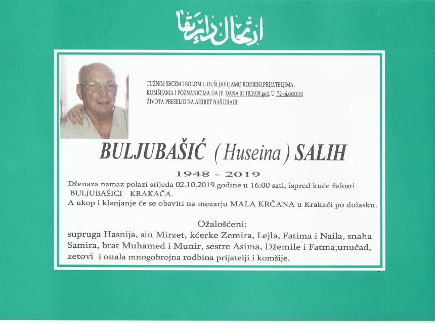 Tužnim srcem i bolom u duši javljamo rodbini, prijateljima, komšijama i poznanicima da je dana 01.10.2019. godine u 72-oj godini života preselio na Ahiret naš dragi Buljubašić (Huseina) Salih.
