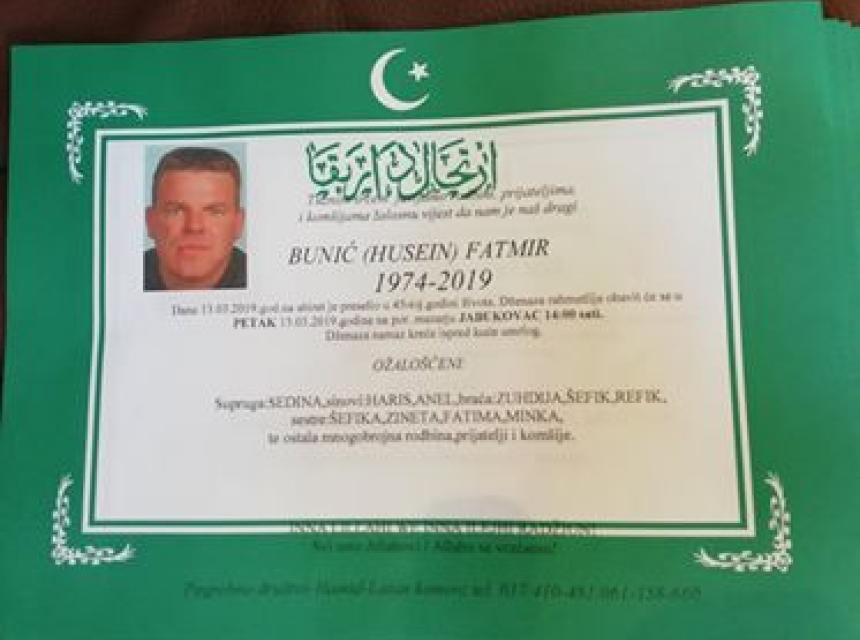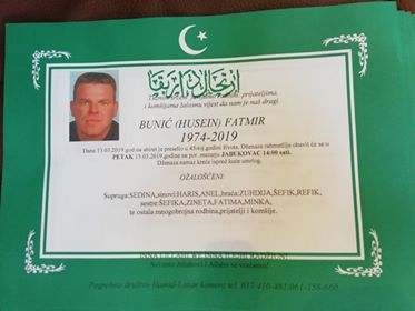 Obavještavamo rodbinu, komšije i prijatelje da je 13.03.2019. u 45 godini života na Ahiret preselio Bunić (Husein) Fatmir.