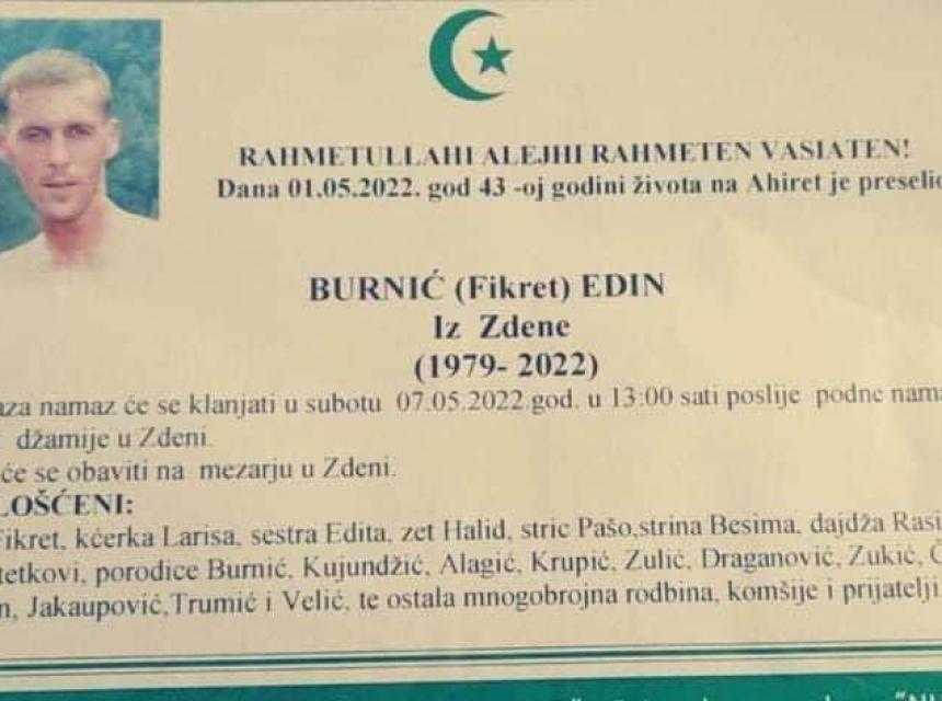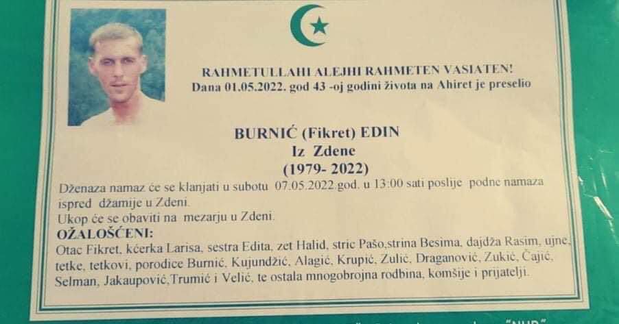 Tužnog srca i s bolom u duši obavještavamo rodbinu, komšije i prijatelje da je naš dragi Burnić (Fikret) Edin u 43. godini života preselio na Ahiret.
