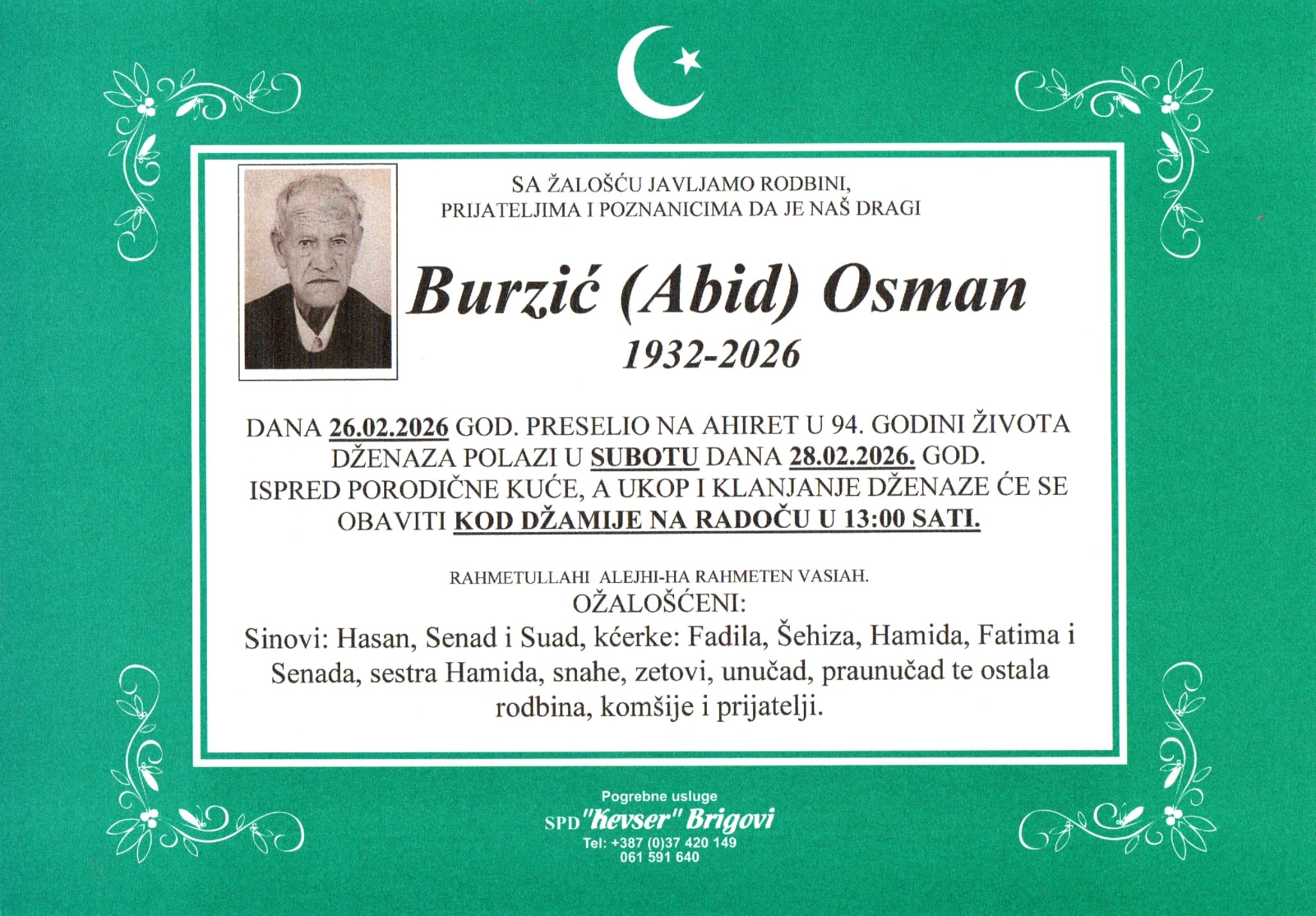 DŽENAZA POLAZI U SUBOTU DANA 28.02.2026. GOD. ISPRED PORODIČNE KUĆE, A UKOP I KLANJANJE DŽENAZE ĆE SE OBAVITI KOD DŽAMIJE NA RADOČU U 13:00 SATI.
