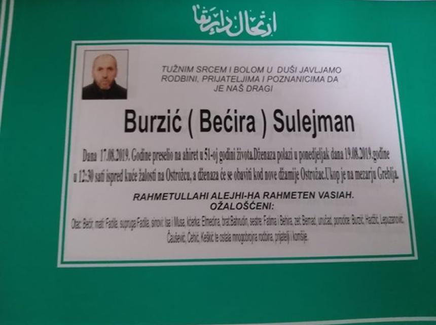 Tužnim srcem i bolom u duši javljamo rodbini, prijateljima i poznanicima da je naš dragi Burzić (Bećira) Sulejman dana 17.08.2019. godine preselio na Ahiret u 51-oj godini života.