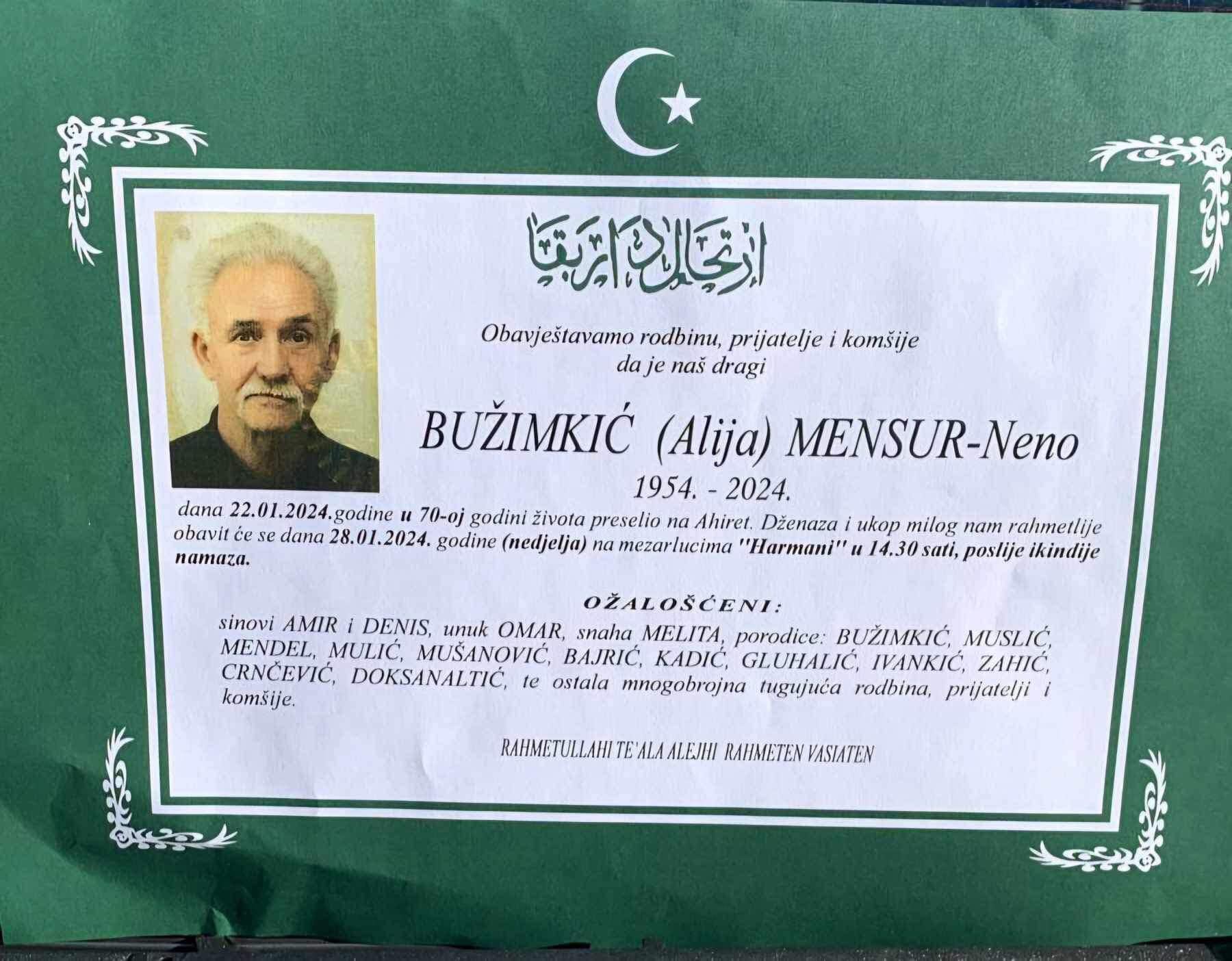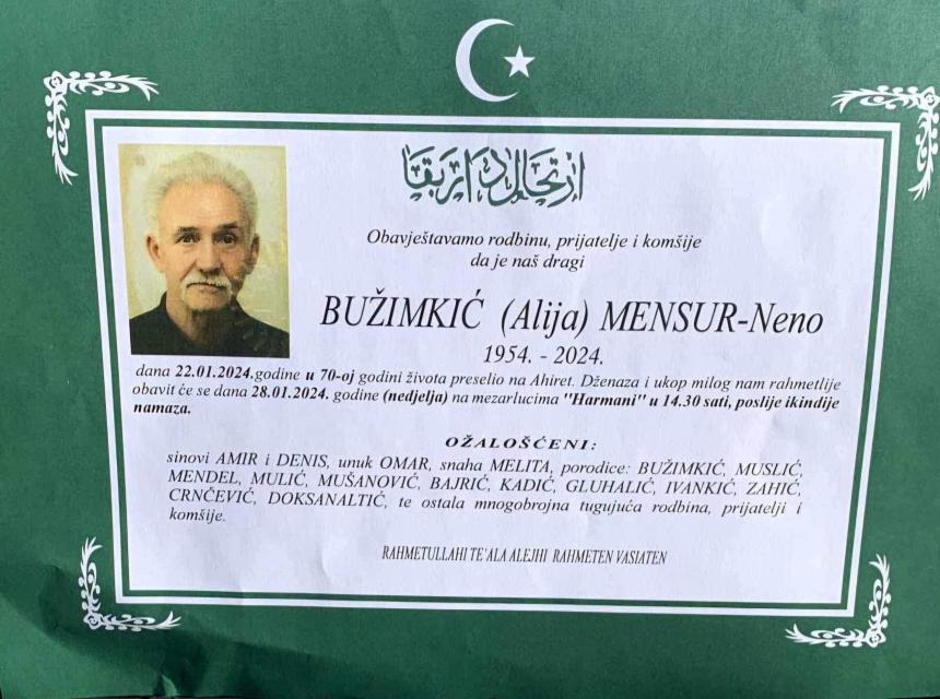 Tuznim srcem javljamo rodbini, prijateljima i poznanicima zalosnu vijest da nam je nas dragi Bužimkić (Alija) Mensur-Neno, dana 22.01.2024 godine u 70-oj godini na Ahiret preselio.