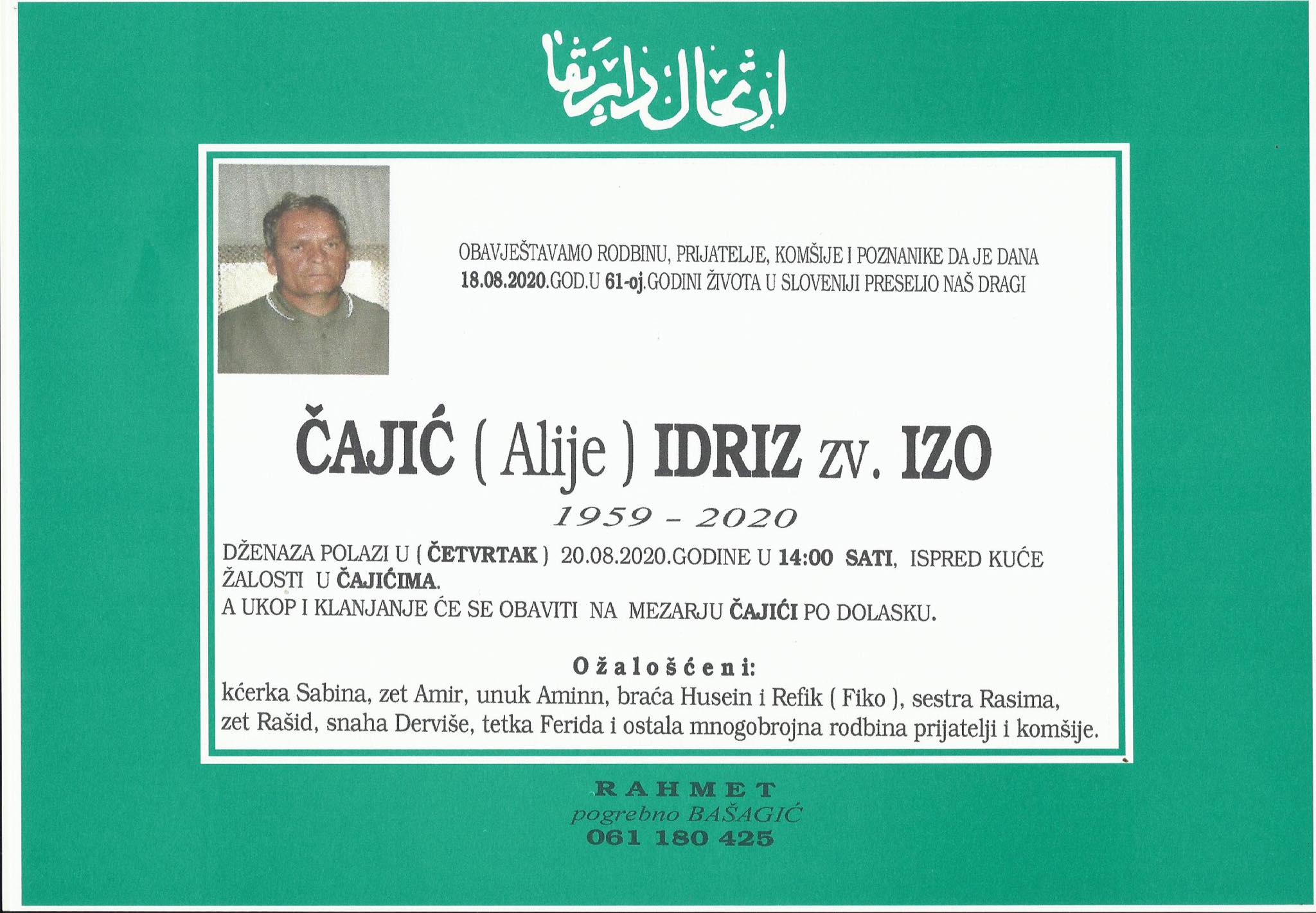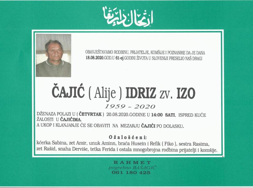 Tužnog srca i s bolom u duši obavještavamo rodbinu, komšije i prijatelje da je naš dragi Čajić (Alije) Idriz zv. Izo dana 18. augusta 2020. godine, u 61. godini života, preselio na Ahiret.