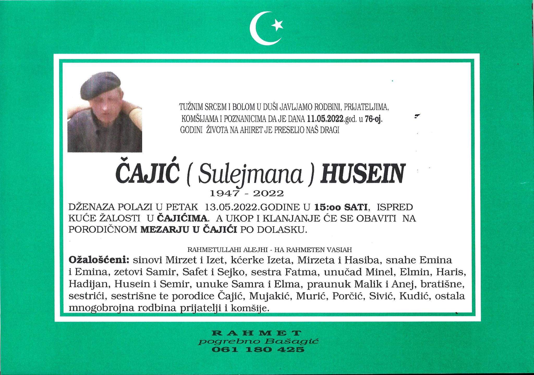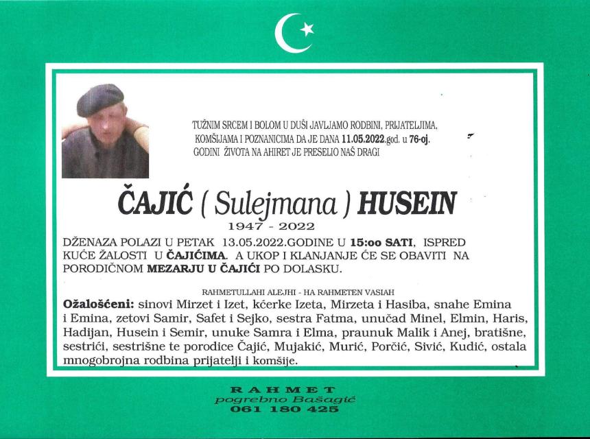 Tužnog srca i s bolom u duši obavještavamo rodbinu, komšije i prijatelje da je naš dragi Čajić (Sulejmana) Husein u 76. godini života preselio na Ahiret.