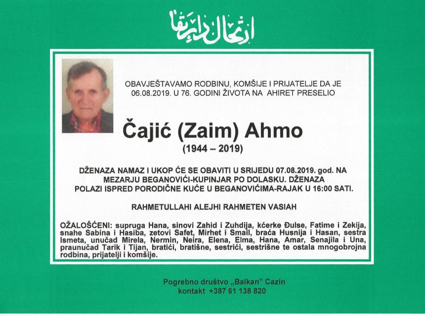 Obavještavamo rodbinu, komšije i prijatelje da je 06.08.2019. u 76.godini života na Ahiret preselio Čajić (Zaim) Ahmo. Dženaza namaz i ukop će se obaviti u srijedu 07.08.2019. na mazerju Beganovići-Kupinjar po dolasku. Dženaza polazi ispred porodične kuće u Beganovićima-Rajak u 16:00 sati.
