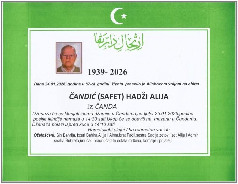 Dženaza će se klanjati ispred džamije u Čandama nedjelja 25.01.2026. godine poslije ikindije namaza u 14:30 sati.
