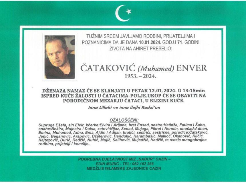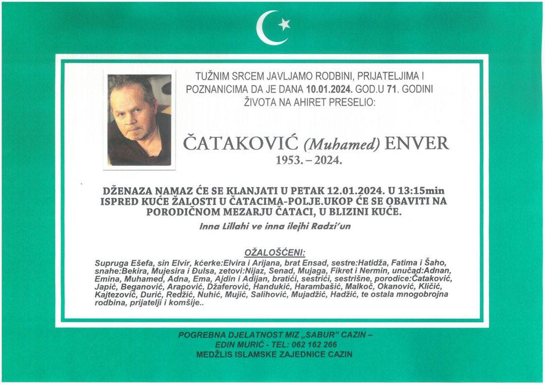 Tužnim srcem javljamo porodici, prijateljima i komšijama da je dana 10.01.2024. god. u 71. godini života na Ahiret preselio Čataković (Muhamed) Enver.