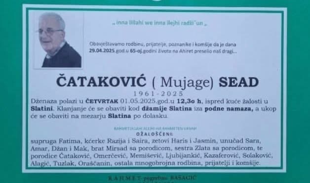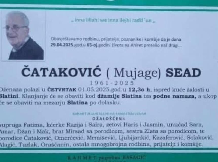 Dženaza polazi u četvratk 01.05.2025. godine u 12:30 sati ispred kuće žalosti u Slatini.