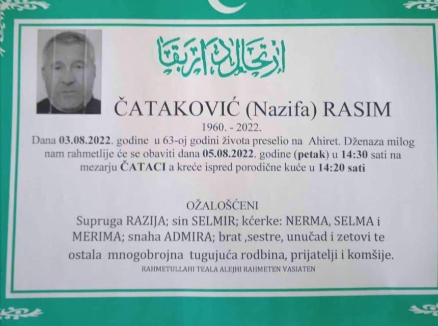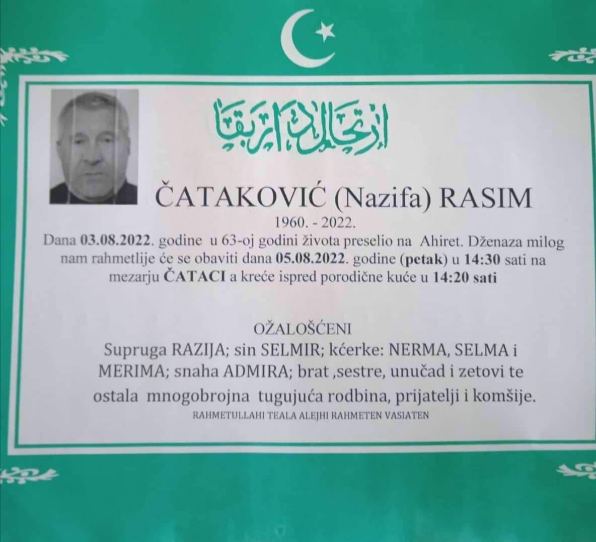 Tužnog srca i s bolom u duši obavještavamo rodbinu, komšije i prijatelje da je naš dragi Čataković (Nazifa) Rasim u 63. godini života preselio na Ahiret.