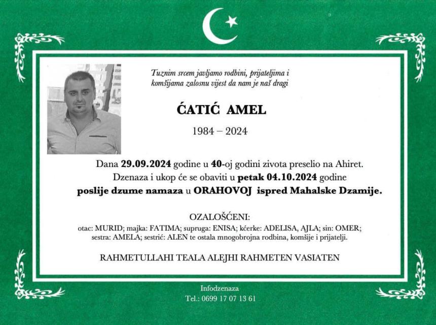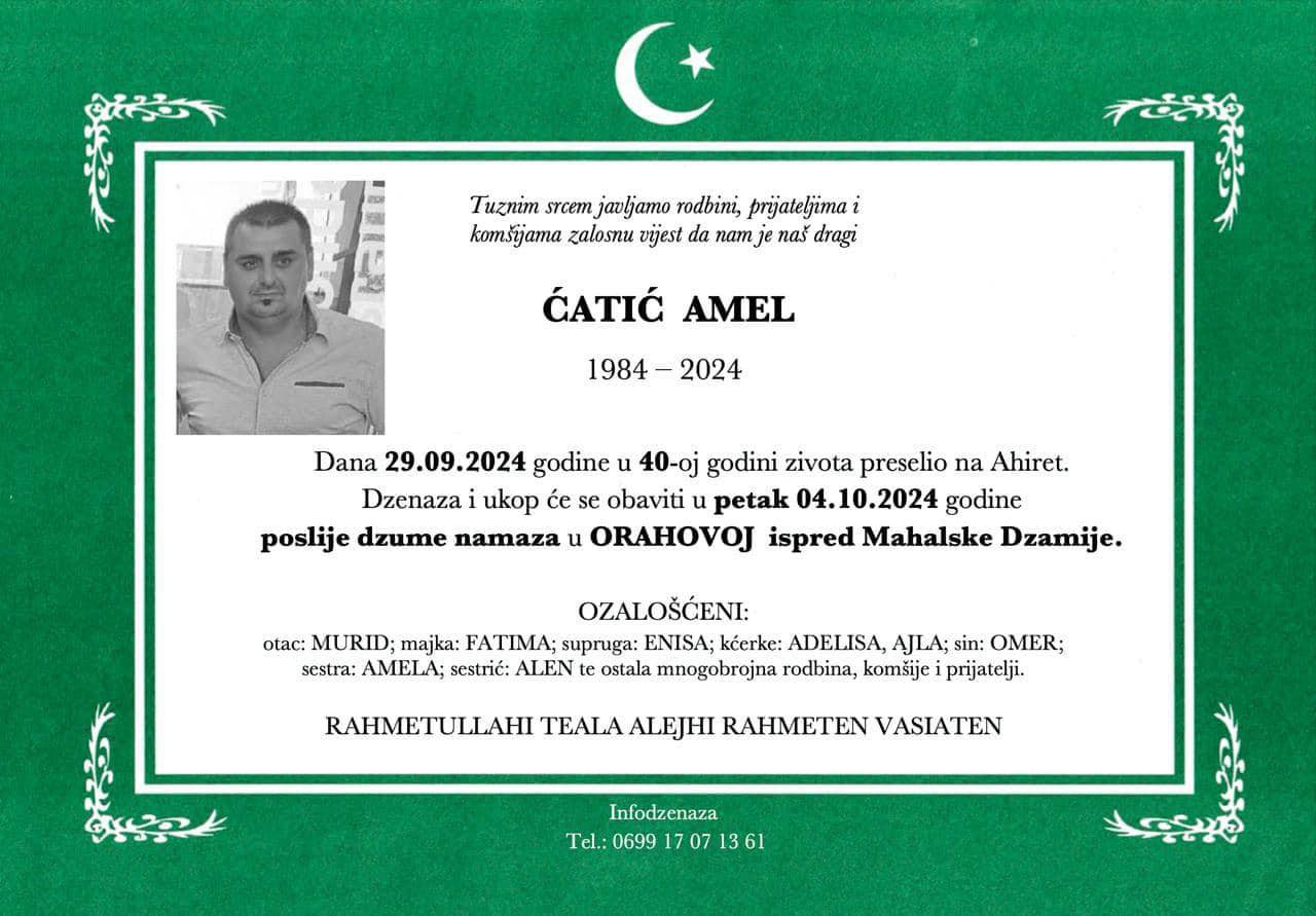 Tužnim srcem i bolom u duši javljamo rodbini, prijateljima i komšijama da je naš dragi Ćatić Amel, dana 29.09.2024. godine u 40-oj godini života, preselio na ahiret.