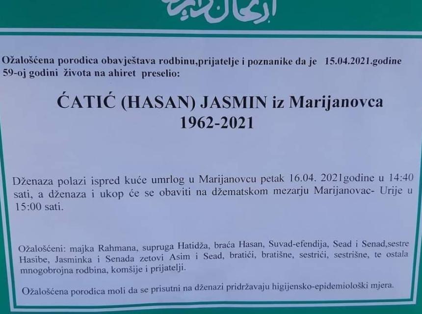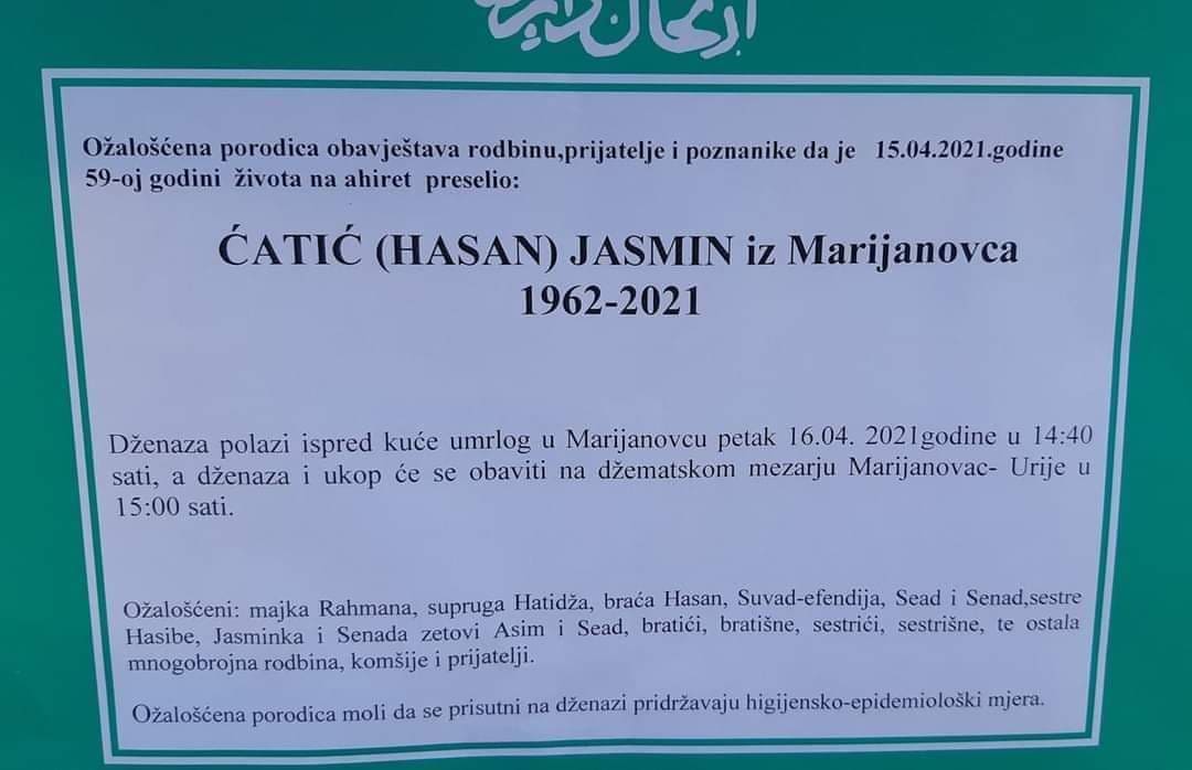 Tužnog srca i s bolom u duši obavještavamo rodbinu, komšije i prijatelje da je naš dragi Ćatić (Hasan) Jasmin iz Marijanovca, 15.04.2021. godine, u 59. godini života preselio na Ahiret.