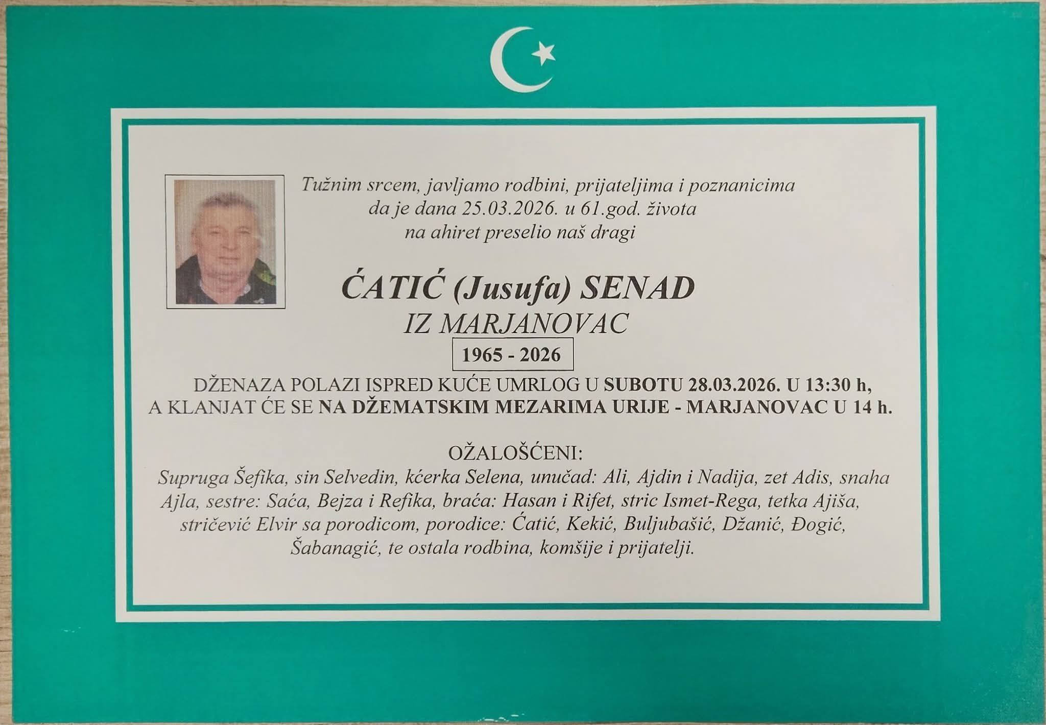 DŽENAZA POLAZI ISPRED KUĆE UMRLOG U SUBOTU 28.03.2026. U 13:30 h, A KLANJAT ĆE SE NA DŽEMATSKIM MEZARIMA URIJE - MARJANOVAC U 14 h.