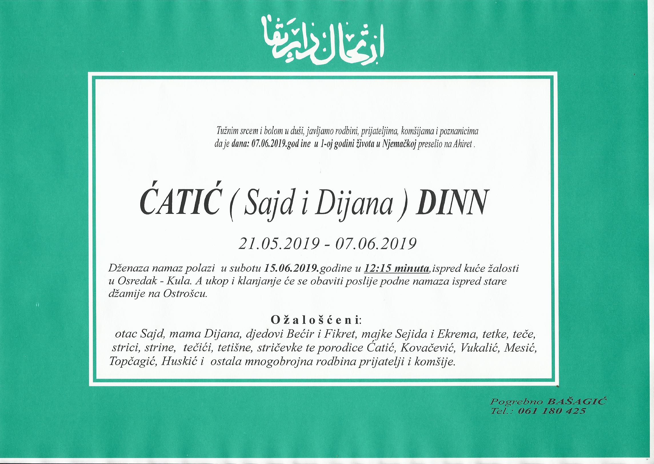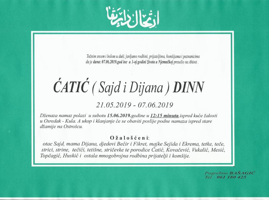 Tužnim srcem i bolom u duši, javljamo rodbini, prijateljima i poznanicima da je dana 07. 06. 2019. godine u 1-oj godini života u Njemačkoj na Ahiret preselio Ćatić (Sajd i Dijana) Dinn.