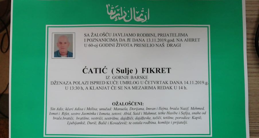 Dženaza polazi ispred kuće umrlog u četvrtak dana 14.11.2019. g. u 13:30h, a klanjat će se na mezarima Redak u 14 h.