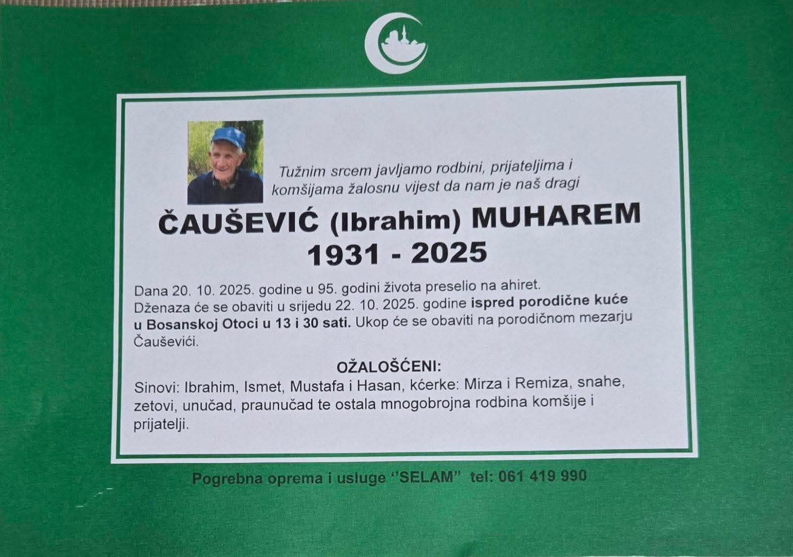 Dženaza će se obaviti u srijedu 22. 10. 2025. godine ispred porodične kuće u Bosanskoj Otoci u 13 i 30 sati.