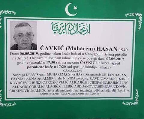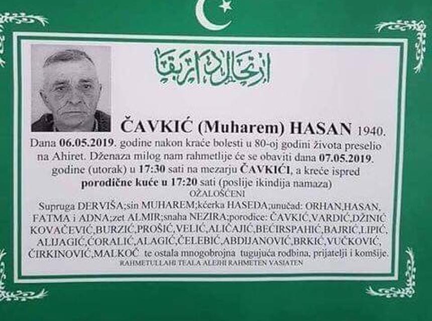 Tužnim srcem i bolom u duši javljamo rodbini, prijateljima, komšijama i poznanicima da je dana 06.05.2019. godine nakon kraće bolesti u 80.-oj godini života na Ahiret preselio naš dragi Čavkić (Muharem) Hasan