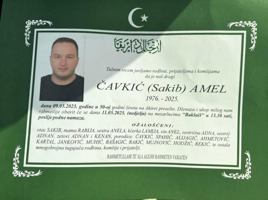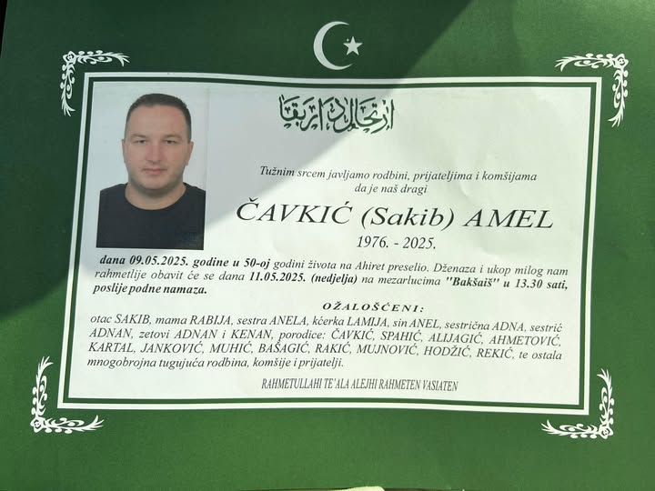 Tužna srca obavještavamo rodbinu, prijatelje i komšije da je u srijedu, 09.05.2025. god. u 50. godini života, na ahiret preselio naš dragi Čavkić (Sakib) Amel.