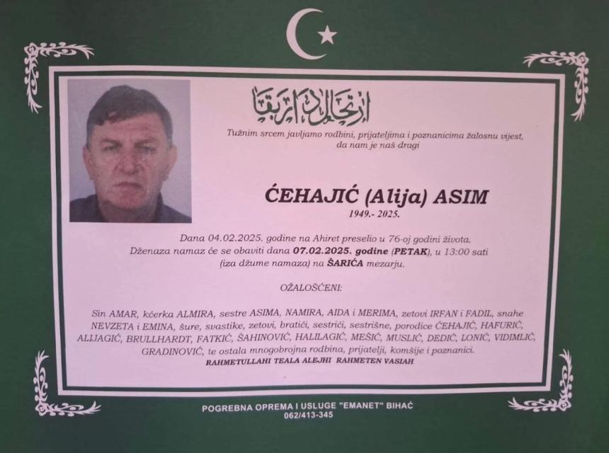 Duboko ožalošćeni obavještavamo rodbinu, prijatelje i komšije da je dana 04.02.2025. god. u 76-oj godini života na ahiret preselio Ćehajić(Alija)Asim.