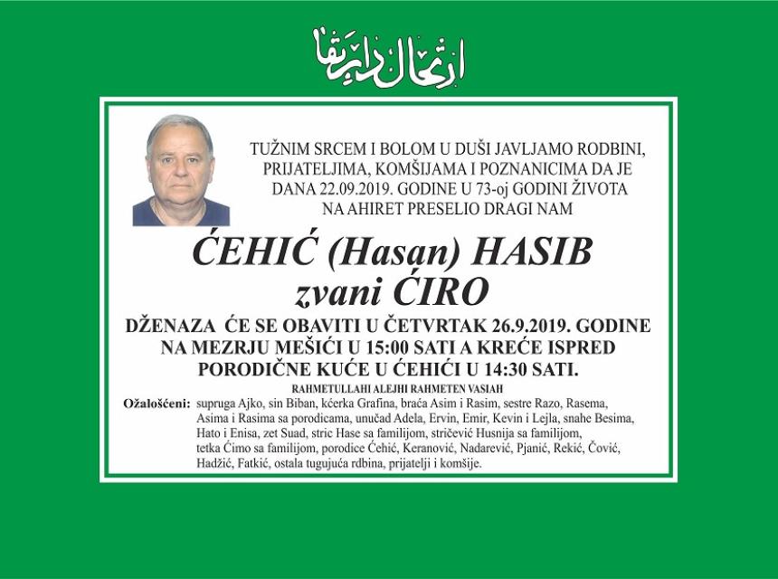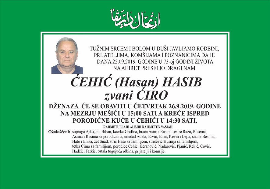 Tužnim srcem i bolom u duši javljamo rodbini, prijateljima, komšijama i poznanicima da je dana 22.09.2019 godine u 73-oj godini života na Ahiret preselio dragi nam Ćehić (Hasan) Hasib zvani Ćiro.
