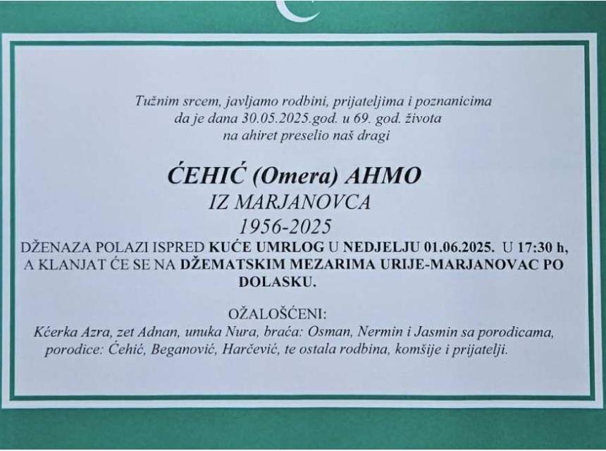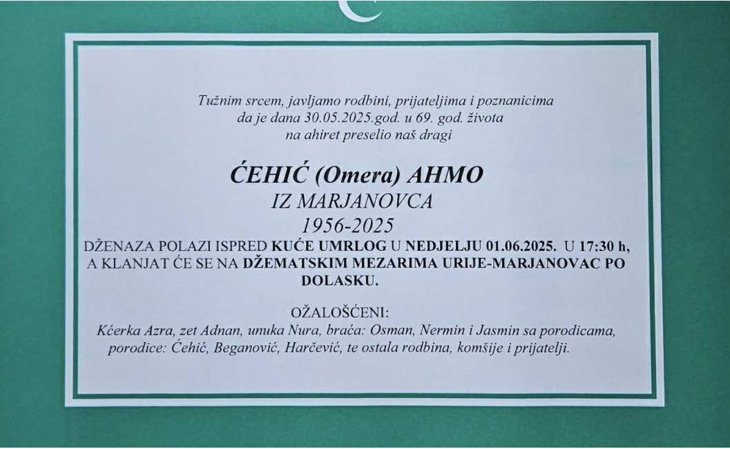 Dženaza polazi ispred kuće umrlog u nedjelju 01.06.2025. godine u 17:30 h, a klanjat će se na džematskim mezarima Urije-Marjanovac po dolasku.