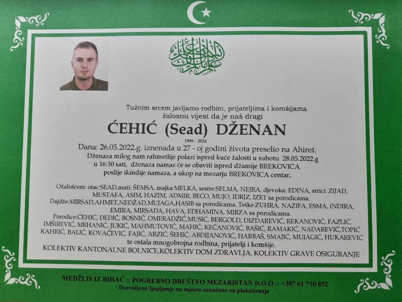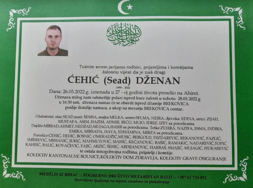 Tužnog srca i s bolom u duši obavještavamo rodbinu, komšije i prijatelje da je naš dragi Ćehić (Sead) Dženan u 27. godini života preselila na Ahiret.