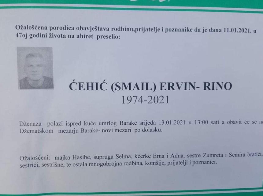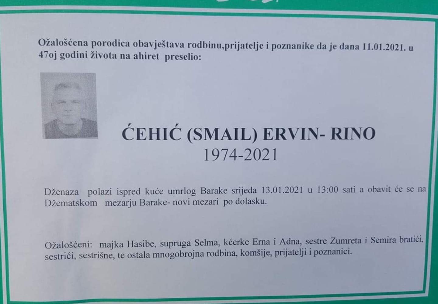 Tužnog srca i s bolom u duši obavještavamo rodbinu, komšije i prijatelje da je naš dragi Ćehić (Smail) Ervin-Rino, dana 11.01.2021. godine, u 47-oj. godini života, preselio na Ahiret.