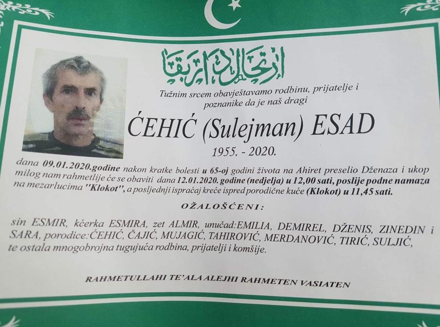 Tužnim srcem i bolom u duši javljamo rodbini i prijateljima da je dana 09.01.2020. godine u 65-oj godini života, na Ahiret preselio Ćehić (Sulejman) Esad.