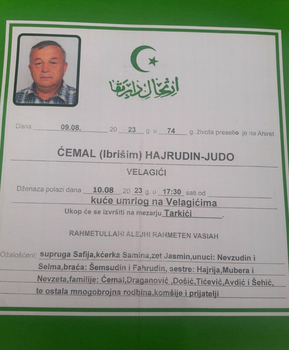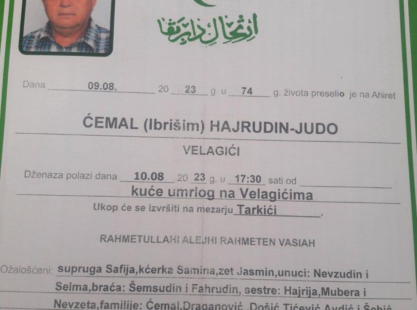 Obavjestavamo rodbinu, prijatelje, poznanike i komsije da je dana 09.08.2023.god.u 74-oj.godini zivota na Ahiret preselio nas dragi Ćemal (Ibrišim) Hajrudin - Judo