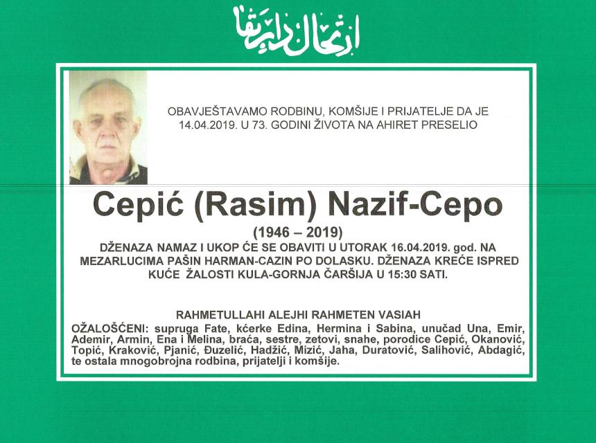 Tužnim srcem javljamo rodbini, prijateljima i komšijama da je dana 14.04.2019. godine u 73-oj godini života na Ahiret preselio naš dragi Cepić (Rasim) Nazif - Cepo.