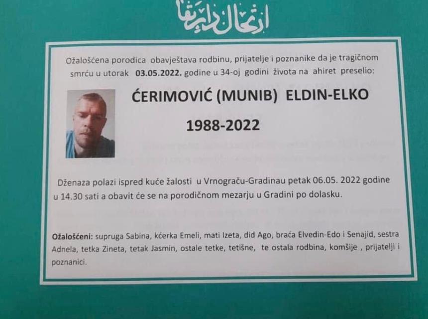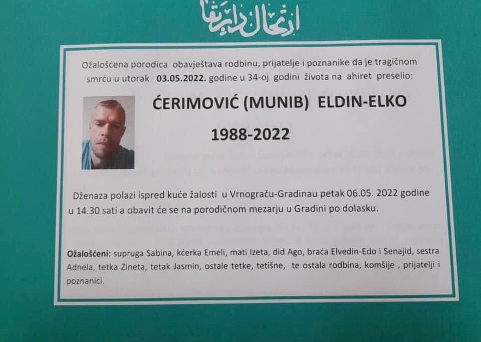 Tužnog srca i s bolom u duši obavještavamo rodbinu, komšije i prijatelje da je naš dragi Ćerimović (Munib) Eldin - Elko u 34. godini života preselio na Ahiret.