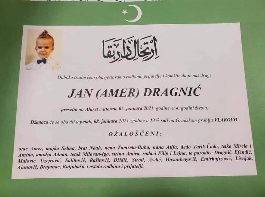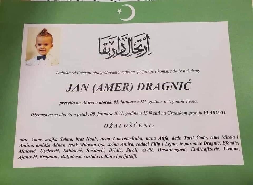 Tužnog srca i s bolom u duši obavještavamo rodbinu, komšije i prijatelje da je naš dragi Jan (Amer) Dragnić 05. januara 2021. godine, u 4. godini života preselio na Ahiret.