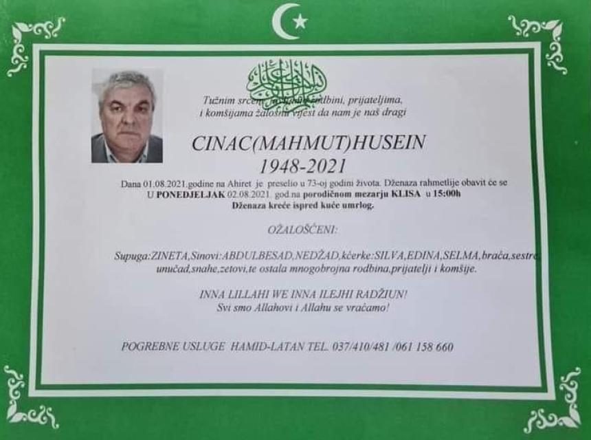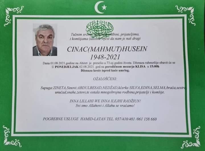 Tužnog srca i s bolom u duši obavještavamo rodbinu, komšije i prijatelje da je naš dragi Cinac (Mahmut) Husein, dana 01.08.2021. godine, u 73-oj godini života, preselio na Ahiret.
