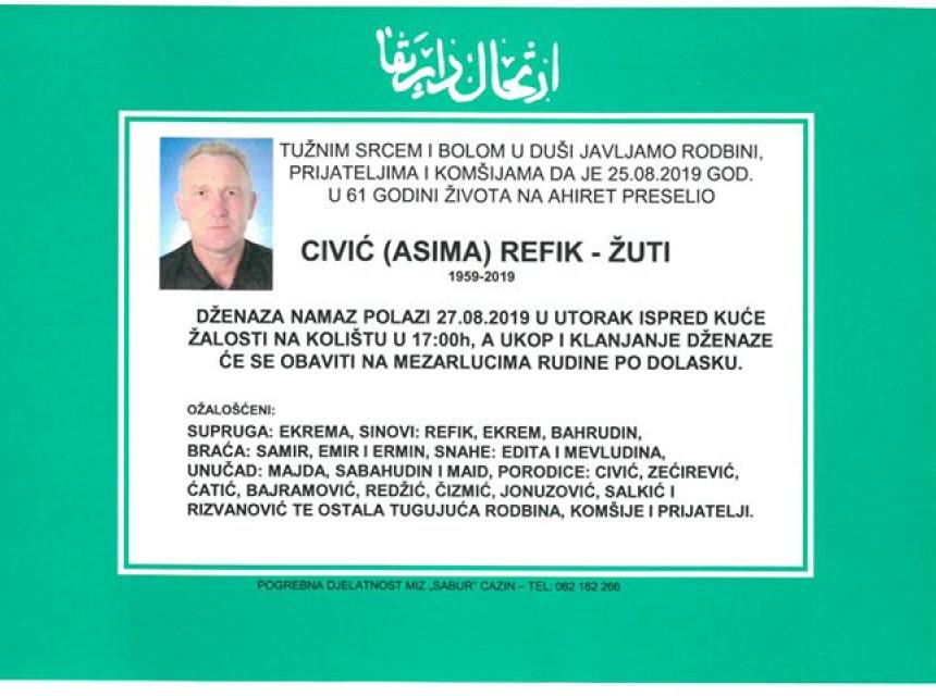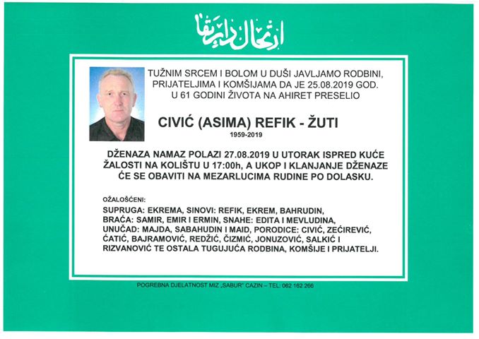 Tužnim srcem i bolom u duši javljamo rodbini, prijateljima, komšijama i poznanicima da je dana 25.08.2019.god. u 61.-oj. godini života preselio na Ahiret naš dragi Civić (Asima) Refik - Žuti.