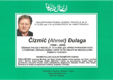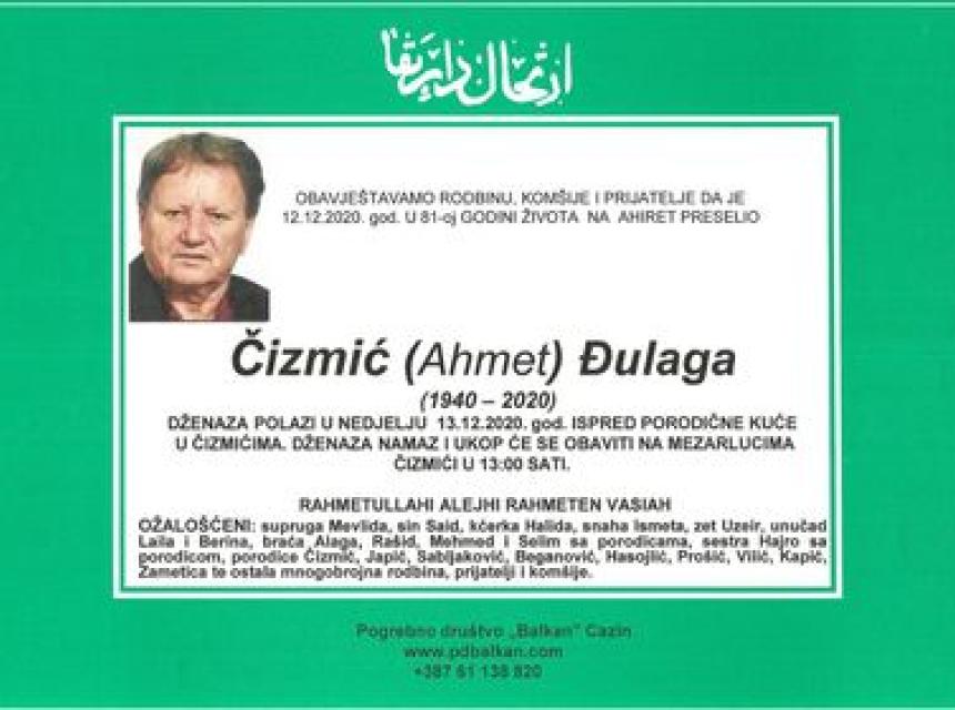 Tužnog srca i s bolom u duši obavještavamo rodbinu, komšije i prijatelje da je naš dragi Čizmić (Ahmet) Đulaga, dana 12.12.2020. godine, u 81-oj. godini života, preselilo na Ahiret.
