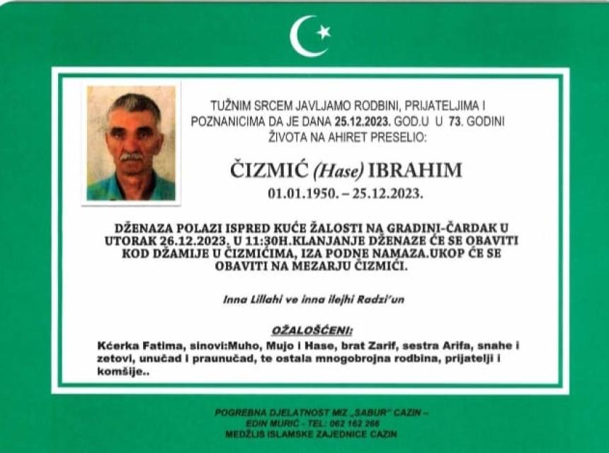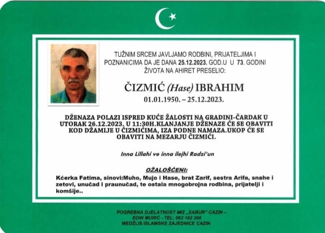 Obavještavamo rodbinu, prijatelje, poznanike i komšije da je dana 25.12.2023.god.u 73-oj godini života na Ahiret preselio naš dragi Čizmić (Hase) Ibrahim.