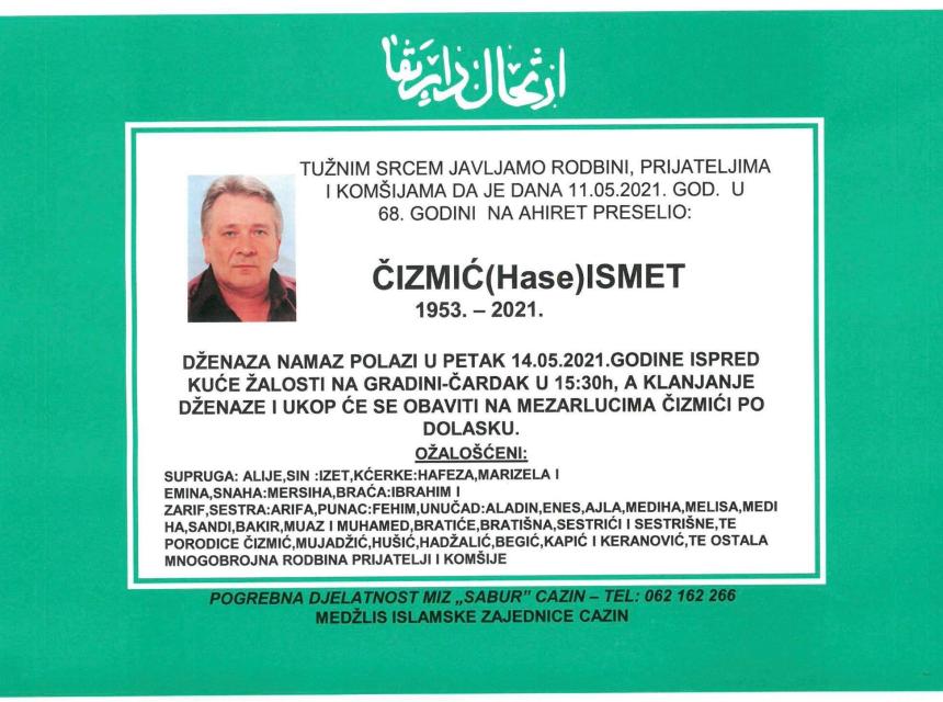 Tužnog srca i s bolom u duši obavještavamo rodbinu, komšije i prijatelje da je naš dragi Čizmić (Hase) Ismet 11.05.2021. god u 68. godini života preselio na ahiret.