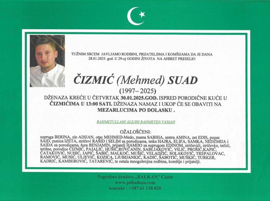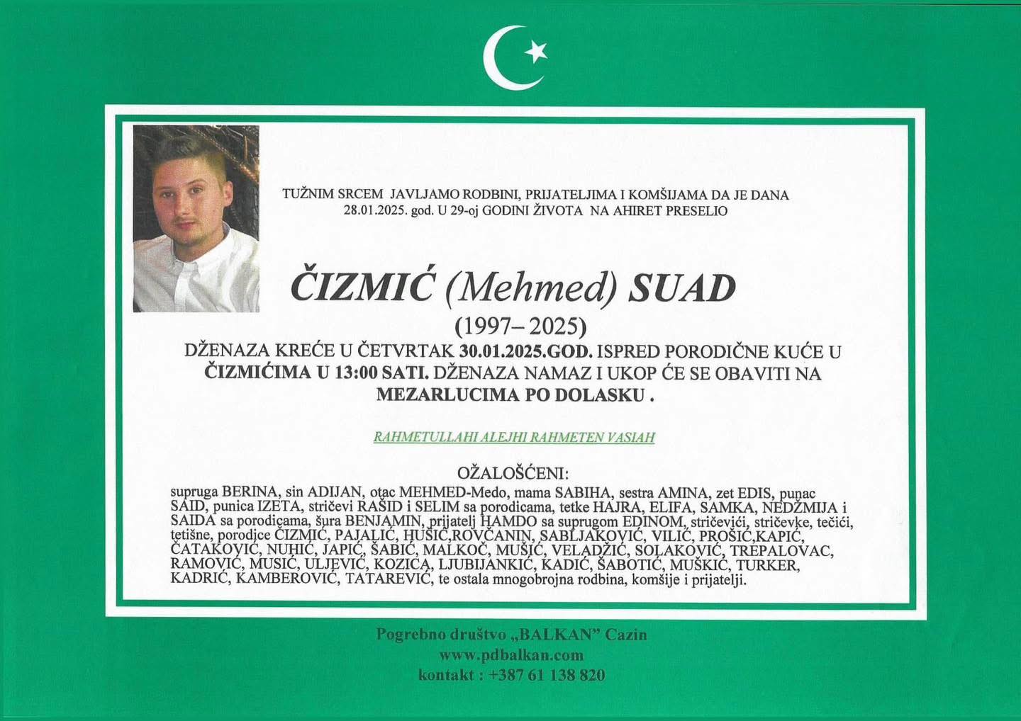 Tužnim srcem obavještavamo rodbinu, prijatelje i poznanike da je dana 28.01.2025. godine u 29. godini na ahiret preselio Čizmić (Mehmed) Suad.