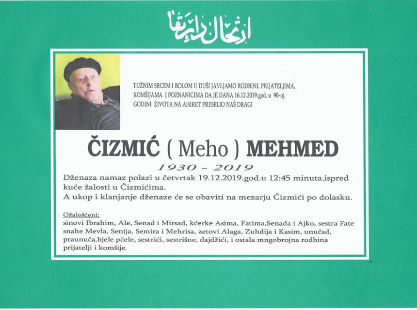 Tužnim srcem i bolom u duši javljamo rodbini i prijateljima da je dana 16.12.2019. godine u 90-oj godini života, na Ahiret preselio Čizmić (Meho) Mehmed. Dženaza polazi u četvrtak, 19.12.2019. godine u 12:45 h, ispred kuće žalosti u Čizmićima. Klanjanje dženaze i ukop će se obaviti na mezarju Čizmići po dolasku.