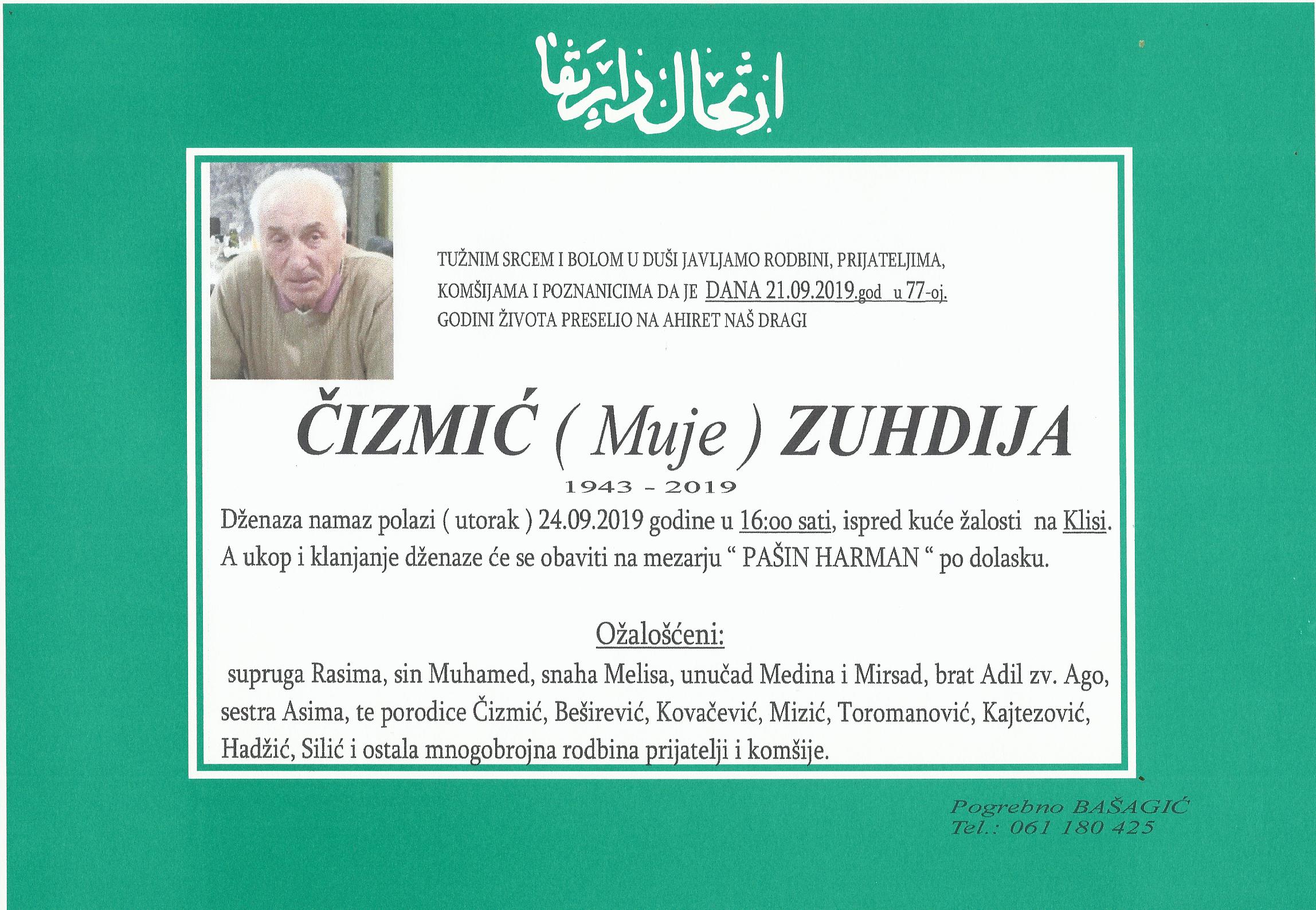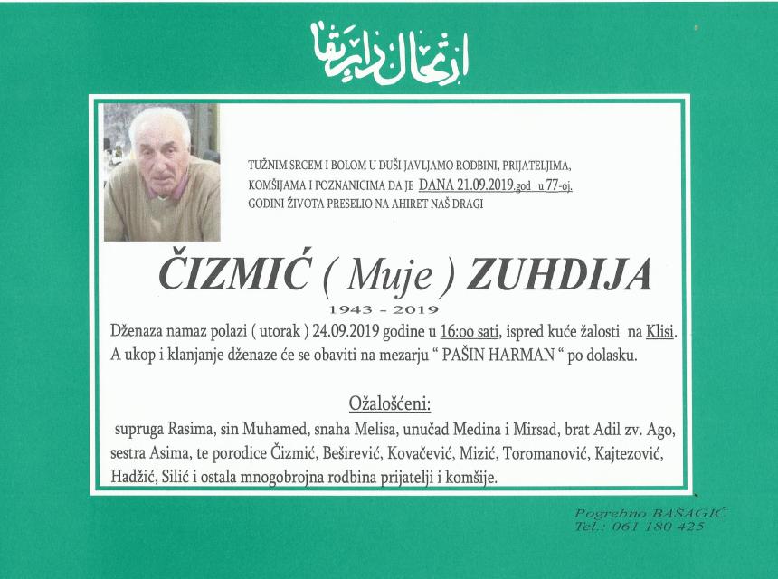 Javljamo rodbini, komšijama, prijateljima i poznanicima da je Čizmić (Muje) Zuhdija preselio na Ahiret 21.09.2019. godine, u 77-oj godini života. Dženaza namaz polazi u utorak, 24.09.2019. u 16:00, ispred kuće žalosti na Klisi. Ukop i klanjanje dženaze obavit će se na mezarju "PAŠIN HARMAN" po dolasku.