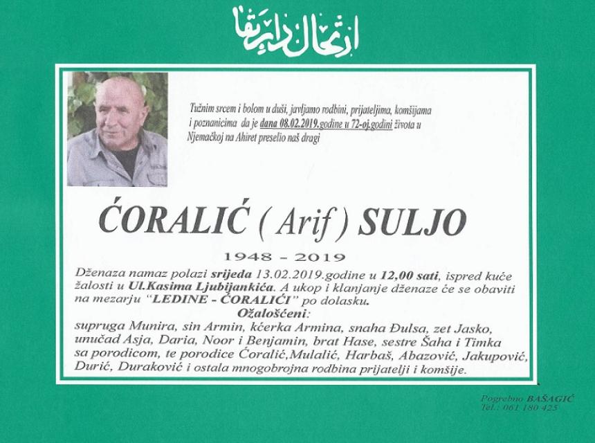 Tužnim srcem i bolom u duši javljamo rodbini, prijateljima, komšijama i poznanicima da je dana 08.02.2019.g. u 72.-oj godini života u Njemačkoj na Ahiret preselio Ćoralić (Arif) Suljo.