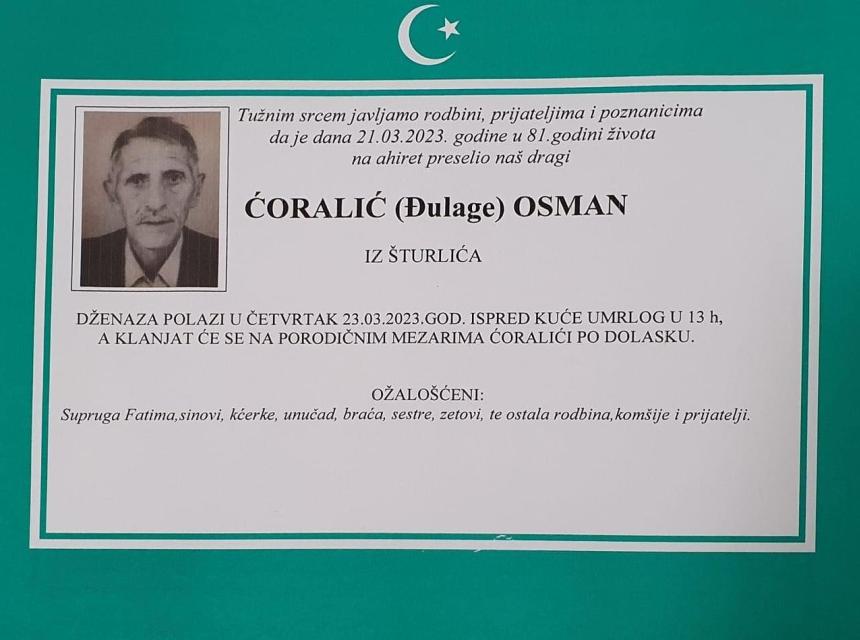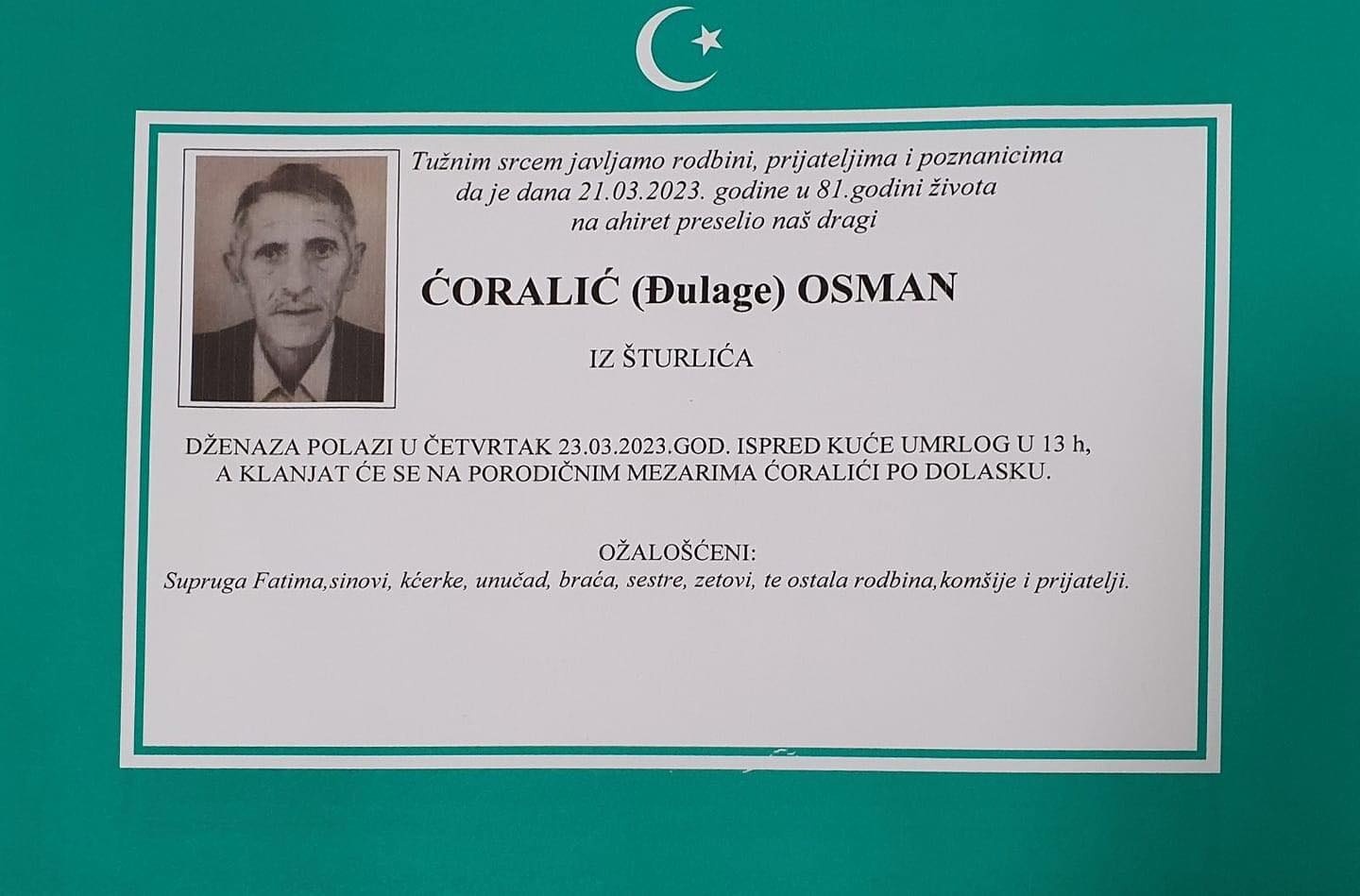 Tužnim srcem i bolom u duši javljamo rodbini, prijateljima i komšijama da je naš dragi Ćoralić (Đulage) Osman