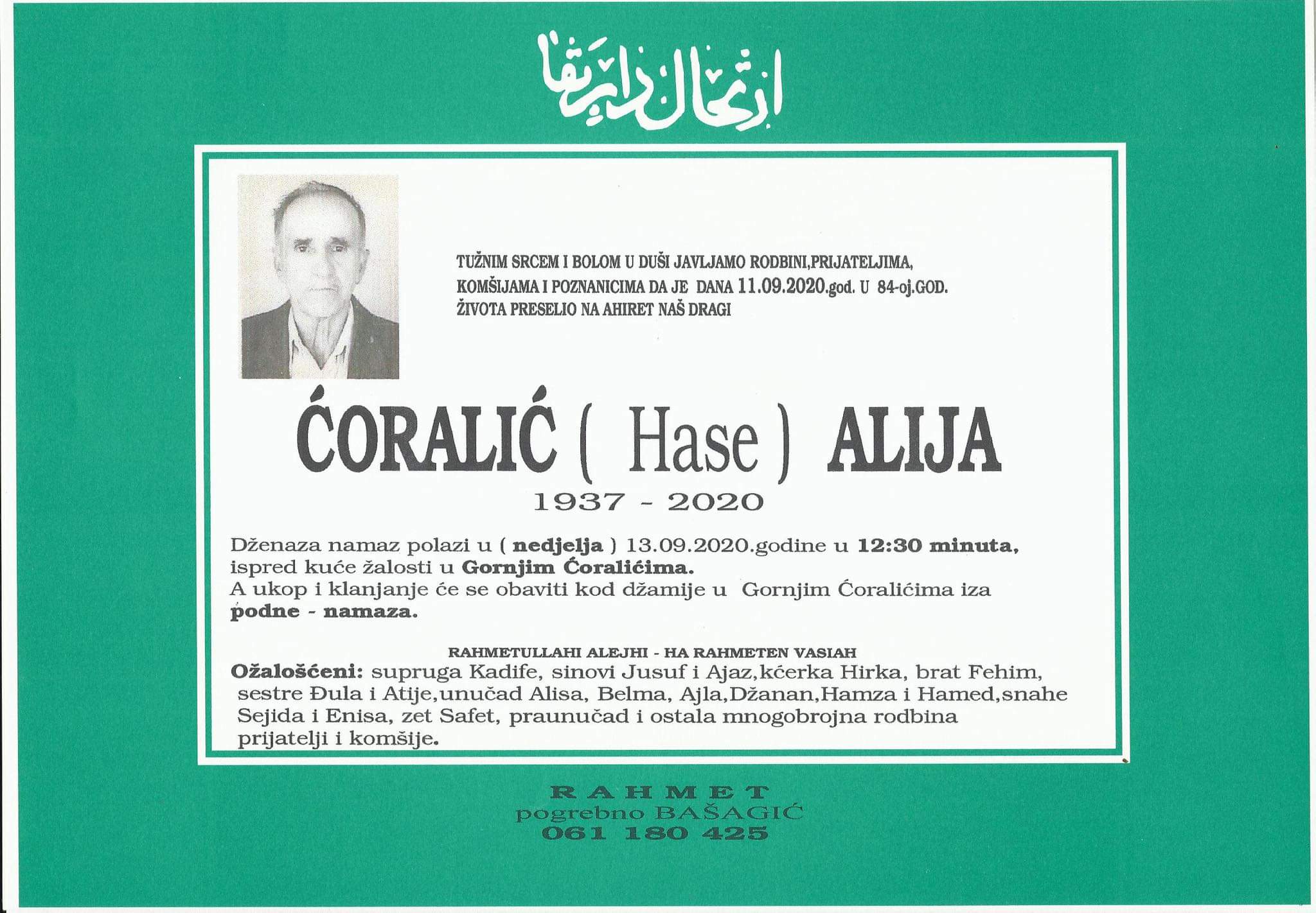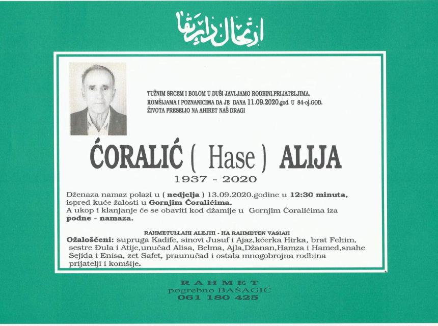 Tužnog srca i s bolom u duši obavještavamo rodbinu, komšije i prijatelje da je naš dragi Ćoralić (Hase) Alija, dana 11.09.2020. godine, u 84-oj. godini života, preselio na Ahiret.