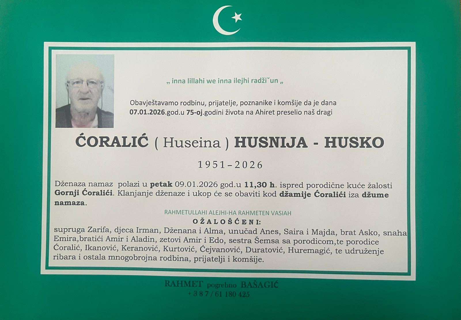 Dženaza-namaz polazi u petak 09.01.2026. god. u 11,30 h, ispred porodične kuće žalosti Gornji Ćoralići. Klanjanje dženaze i ukop će se obaviti kod džamije Ćoralići iza džume-namaza.