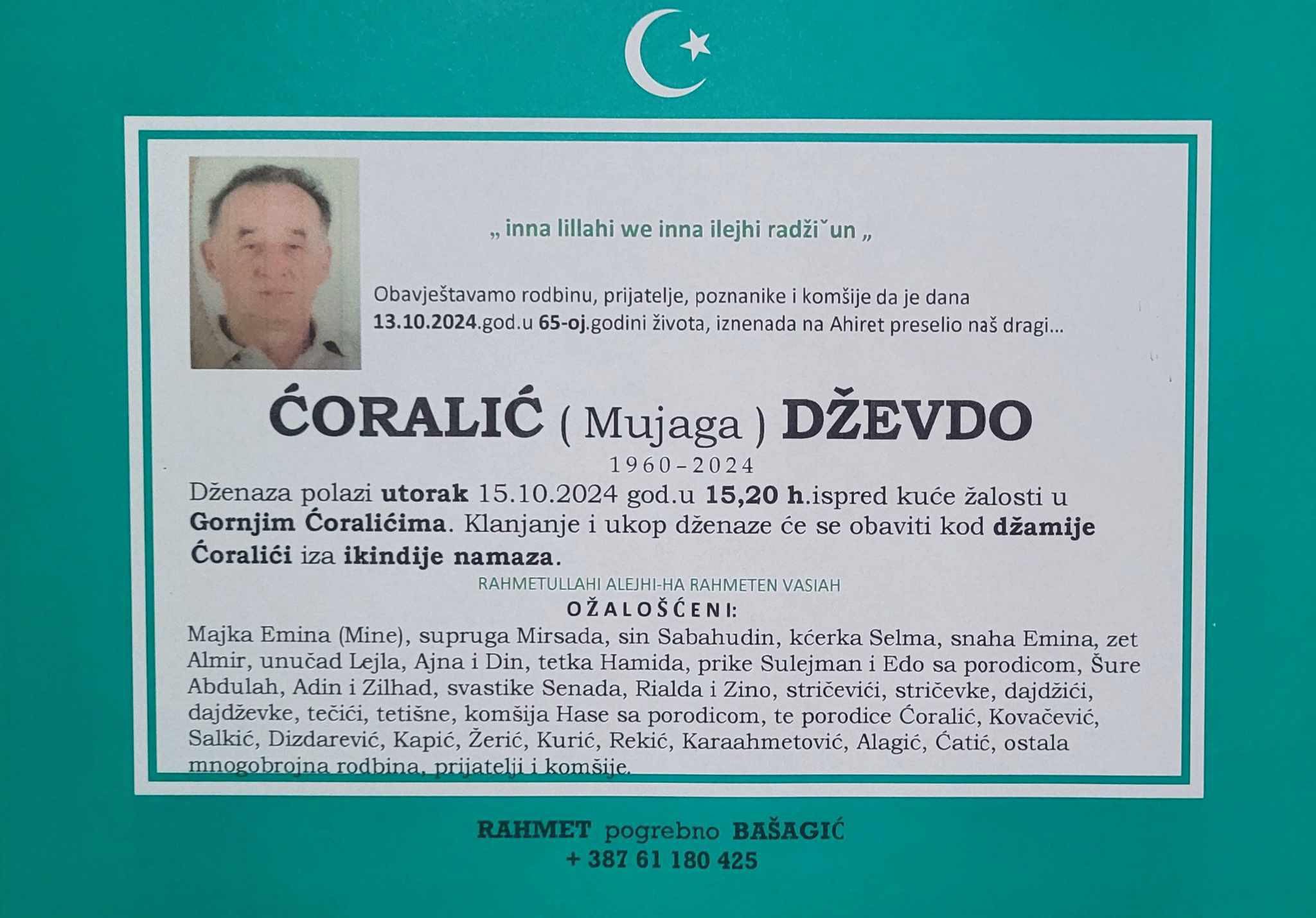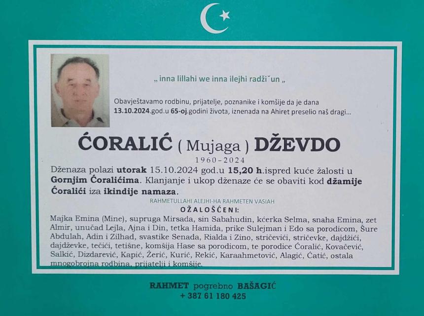 Tužnim srcem i bolom u duši javljamo rodbini, prijateljima i komšijama da je naš dragi Ćoralić (Mujaga) Dževdo, dana 13.10.2024. godine u 65. godini života, preselio na ahiret.