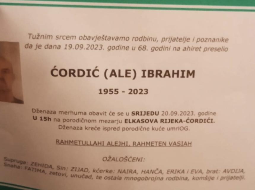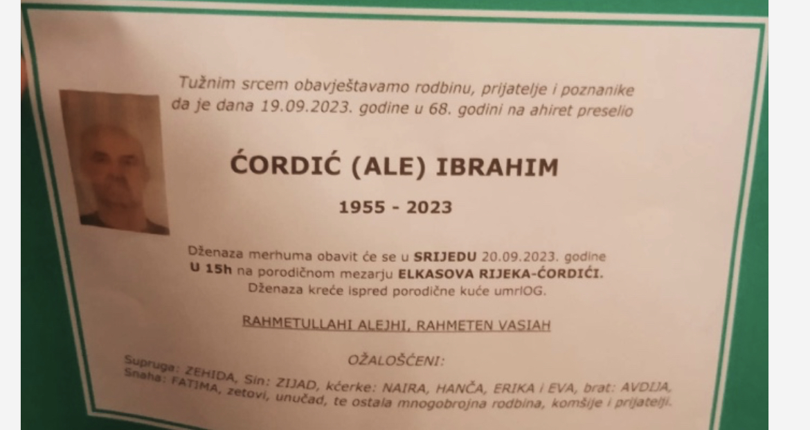 Dženaza merhuma obavit će se u SRIJEDU 20.09.2023. godine U 15h na porodičnom mezarju ELKASOVA RIJEKA-CORDIĆI.