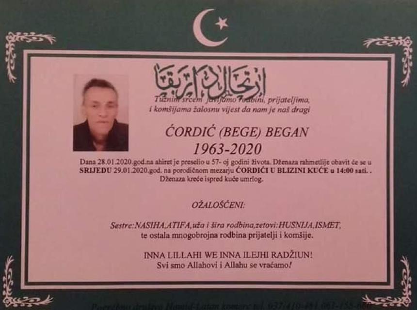 Tužnim srcem i bolom u duši javljamo rodbini i prijateljima da je naš dragi Čordić (Bege) Began dana 28.01.2020. godine preselio na Ahiret u 57. godini života.
