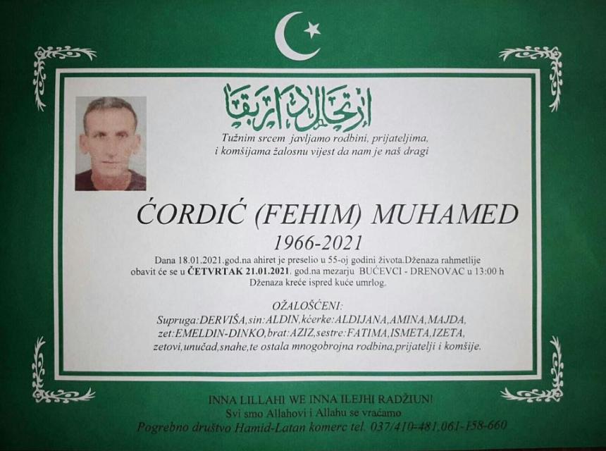 Tužnog srca i s bolom u duši obavještavamo rodbinu, komšije i prijatelje da je naš dragi Ćordić (Fehim) Muhamed 18. januara 2021. godine, u 55. godini života preselio na Ahiret.