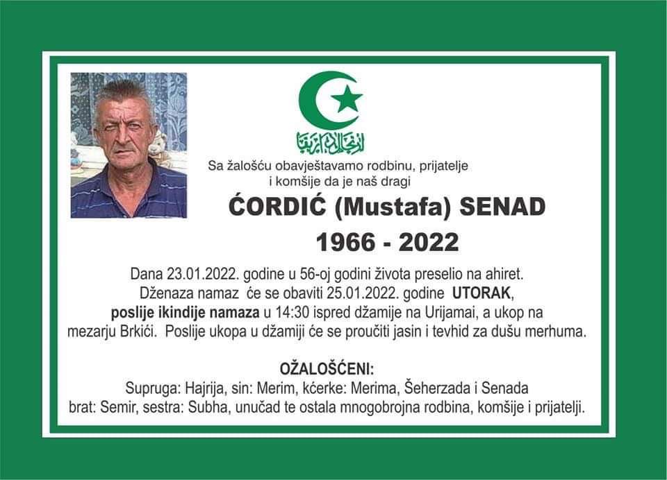 Tužnog srca i s bolom u duši obavještavamo rodbinu, komšije i prijatelje da je naš dragi Ćordić (Mustafa) Senad 23.1.2022. u 56. godini života preselio na ahiret.
